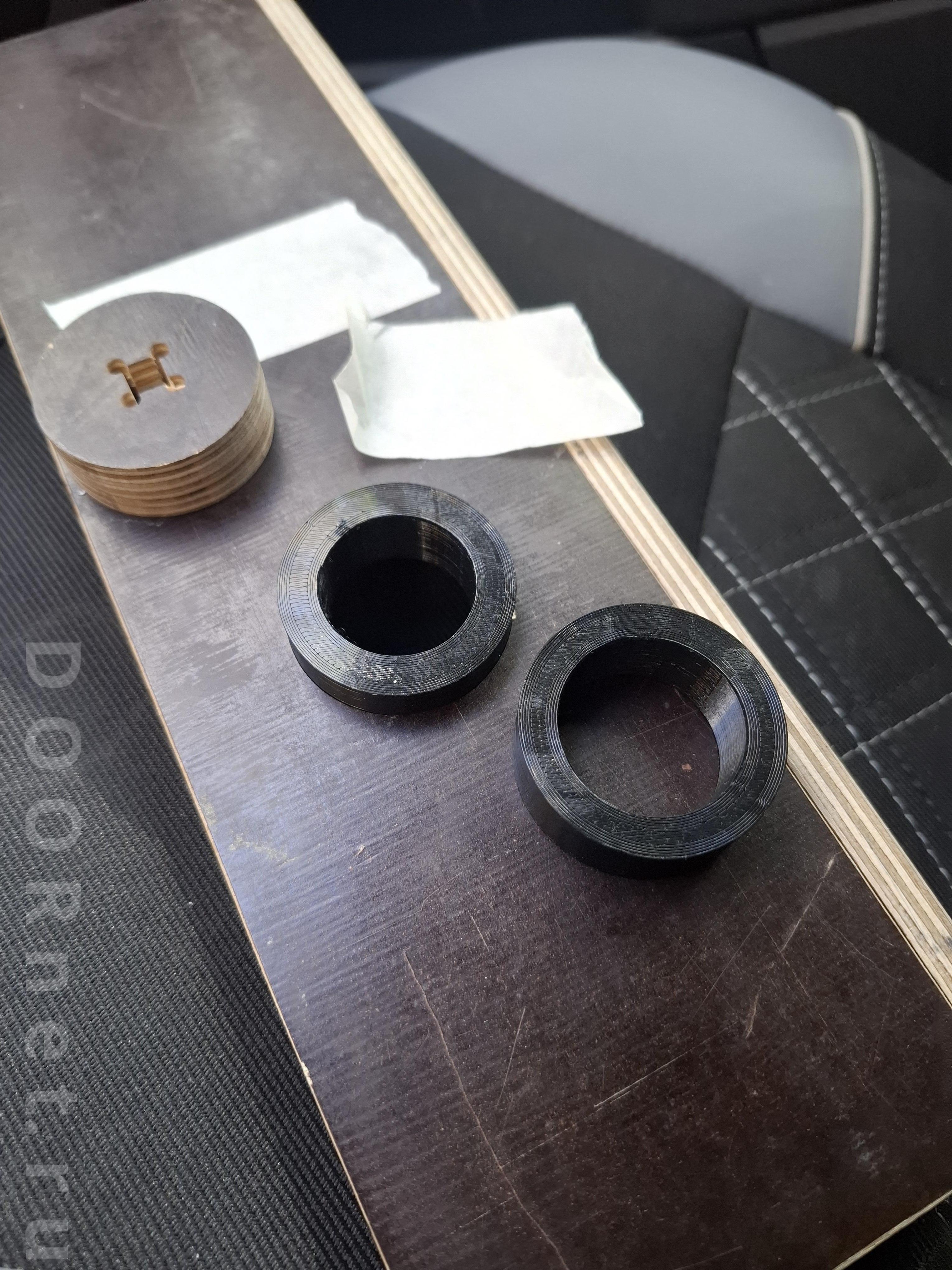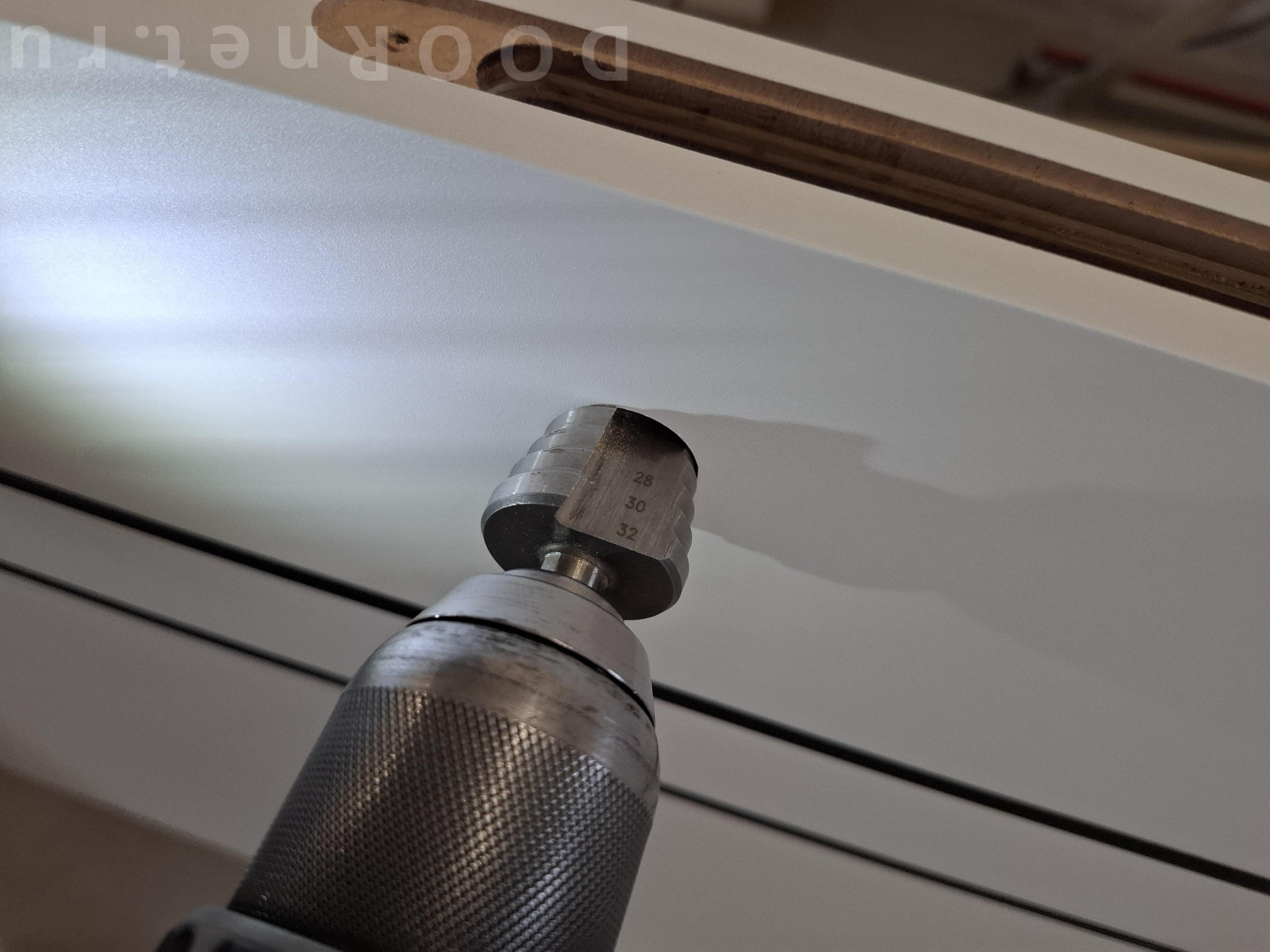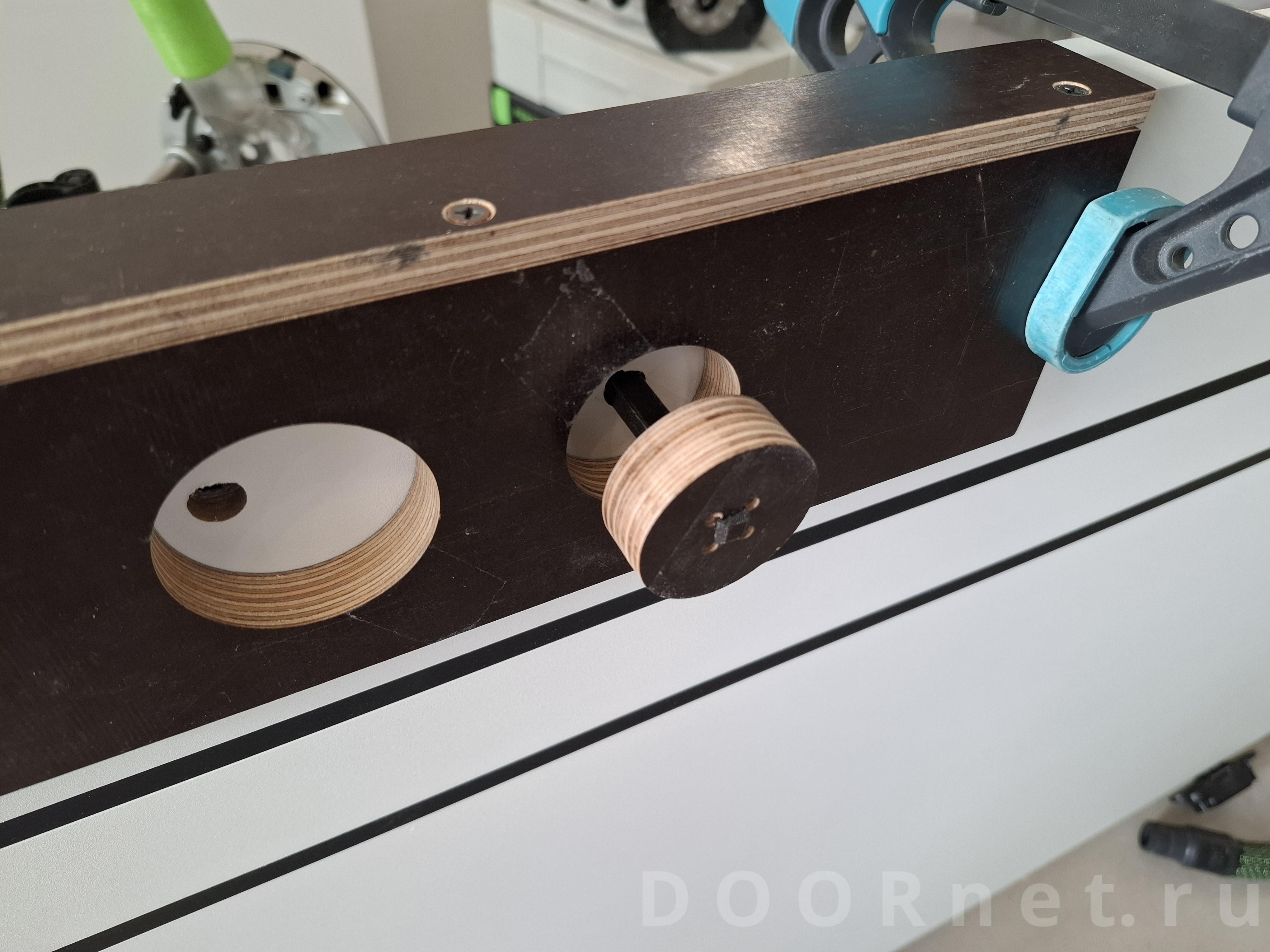 Самодельный шаблон , который использовал для других ручек , пригодился и тут. ничего изобретать не стал и решил отработать объект им. форстнера, перьевые сверла , спец. фрезы с центровочным квадратом использовать не стал. захотел произвести монтаж прессованием колец от ручек в полотна через струбцину с конечной фиксацией внутренним кольцом без клеевых составов и чистотой поверхностью после обработки. задача была точно в центр попасть фрезеровкой для полной соосности и выбрать необходимый диаметр , минус ~ 0,30-0,40 мм., чтобы после запрессовки отработали штатные выступы от проворачивания кольца внутри материала. далее будут фото с подробными комментариями в порядке очередности для понимания моего процесса
