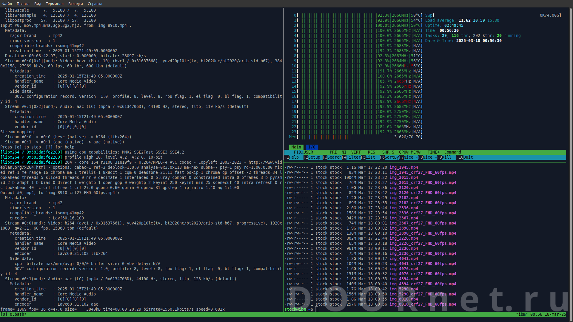 на скрине терминальный мультиплексор tmux c 'ffmpeg' на 24-ех ядрах сpu Xeon