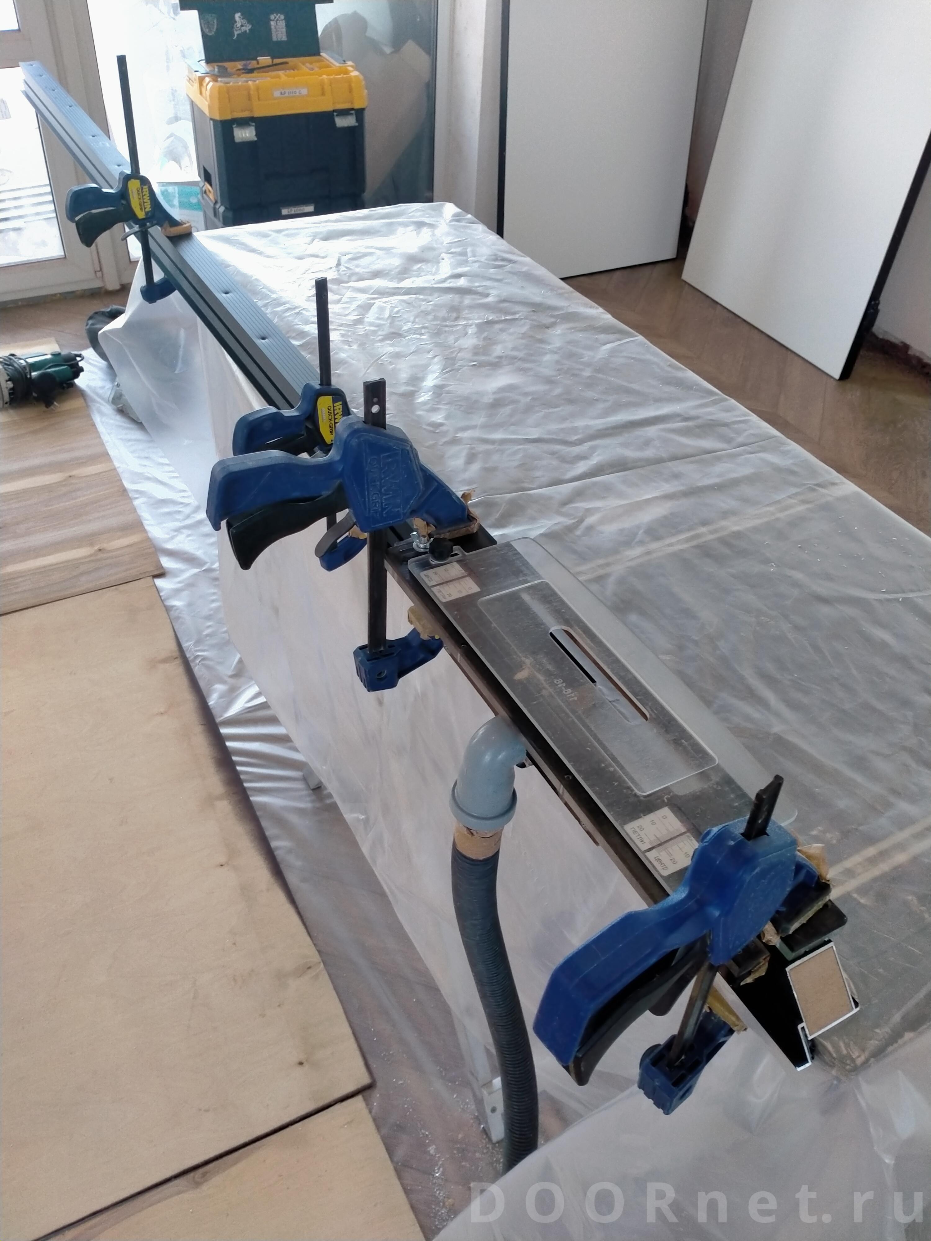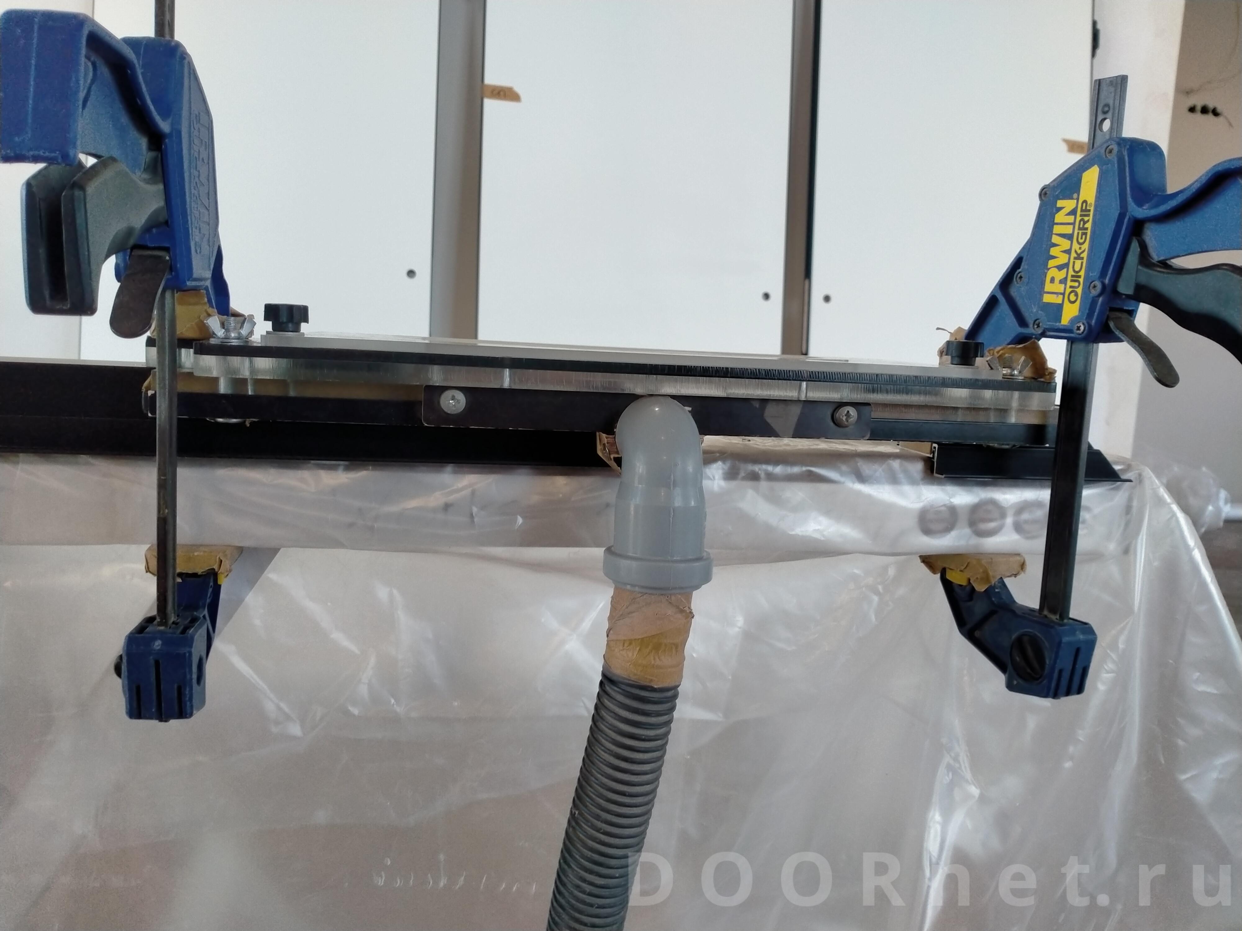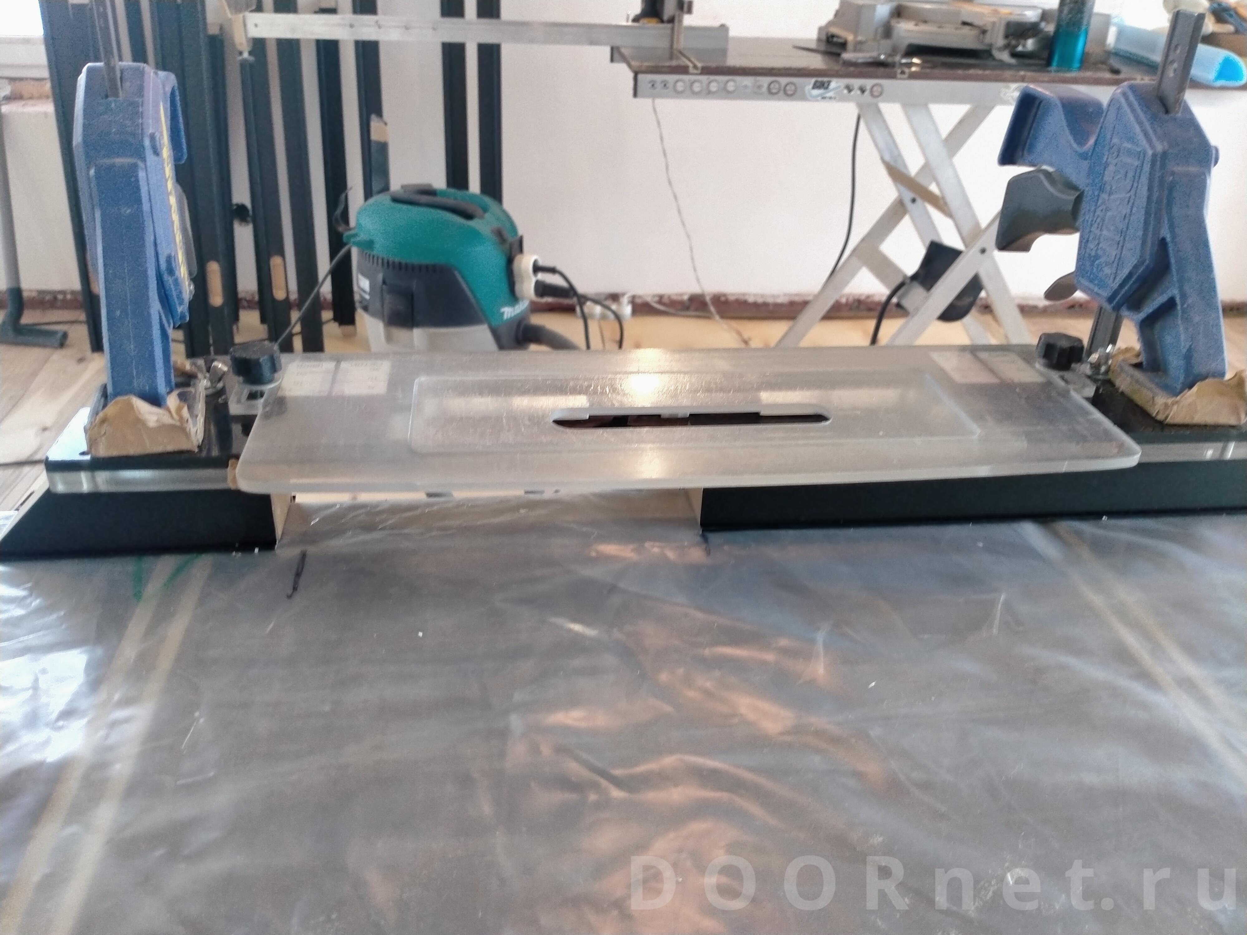 Использовался шаблон Строй Профи. Позиционирования с подгонкой по вставке 16 ×100. Принцип по фото понятен. Использовался отрезок короба для фиксации шаблона по длинне. Регулировка осуществляется по меткам на заготовке на глаз.