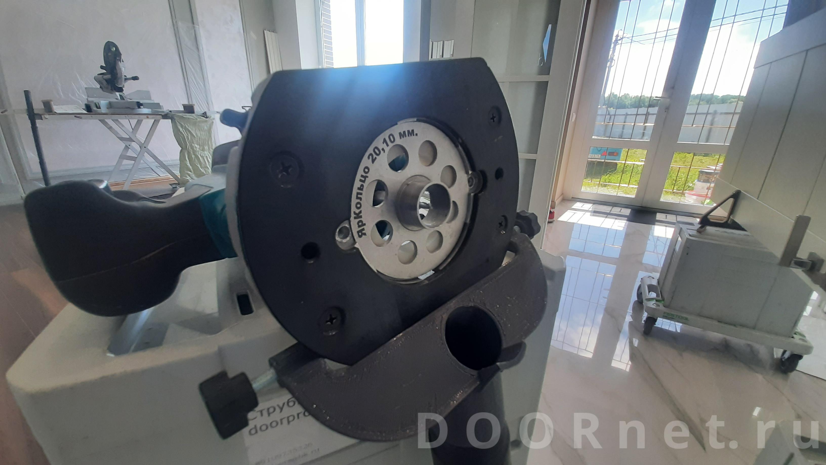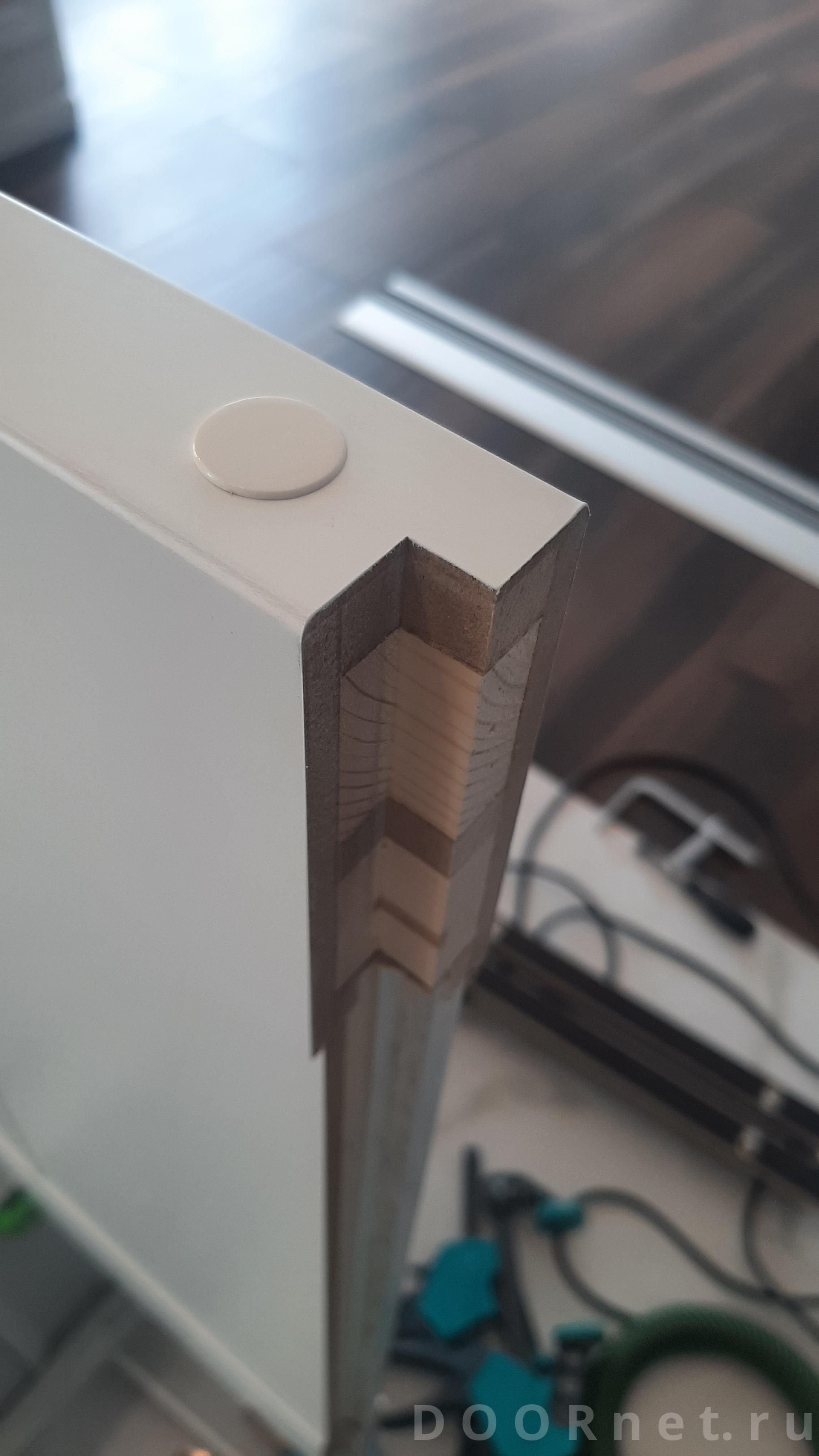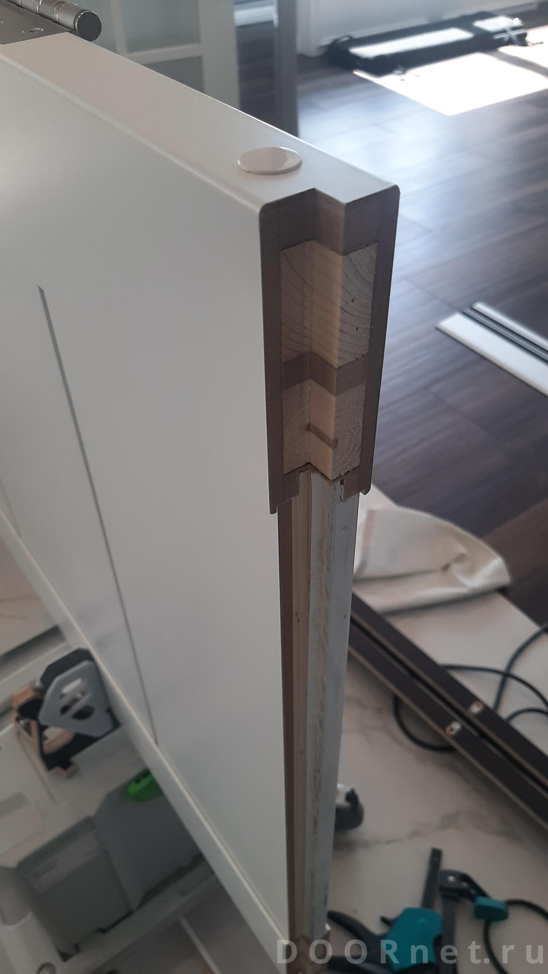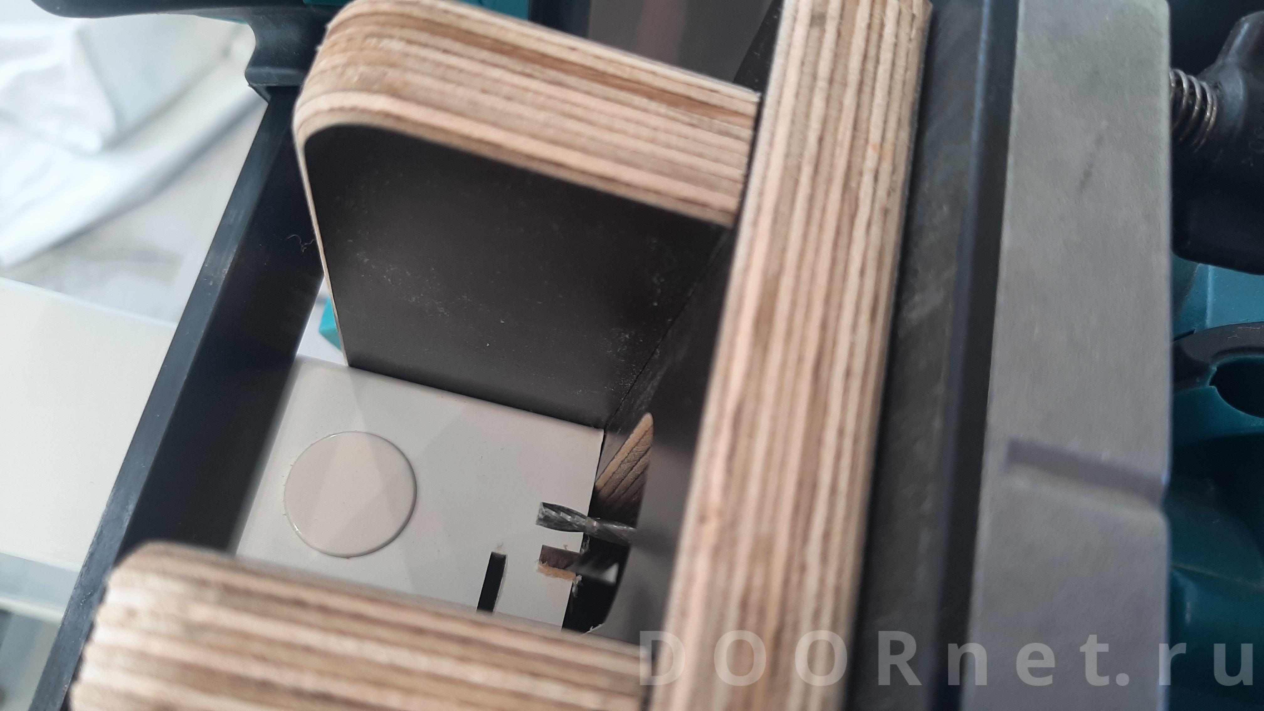 Пришлось искать нетривиальное решение. Первый прогон по лицевой стороне двери был сделан погружной пилой по направляющей шине , с торца подрезал раскроечной спиральной фрезой по шаблону для врезки направляющих, что бы сформировать четверть в которую и будет заходить наше полотно.